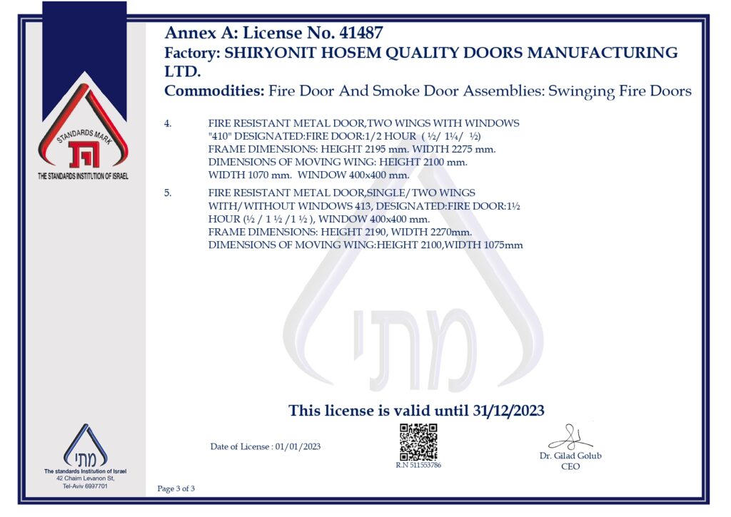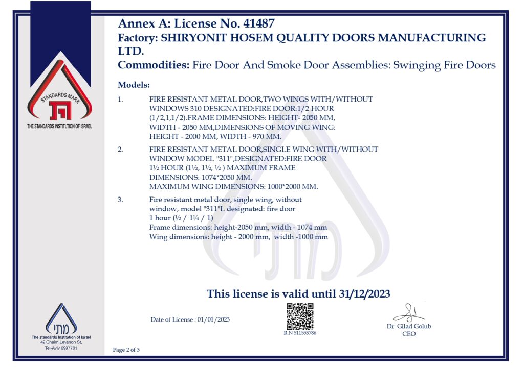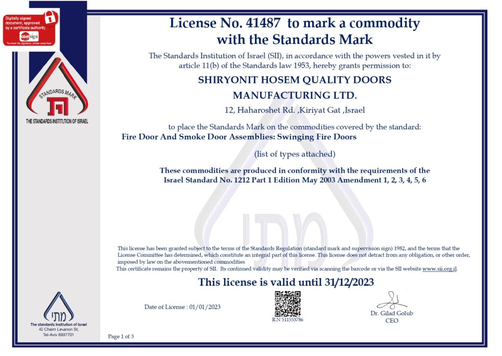 Fire Doors Standard 2023 דף הבית // Standards & Certifications // Fire Doors Standard 2023 Fire Doors Standard 2023 Fire doors by Shiryonit Hosem are certified for Israeli Standard 1212.