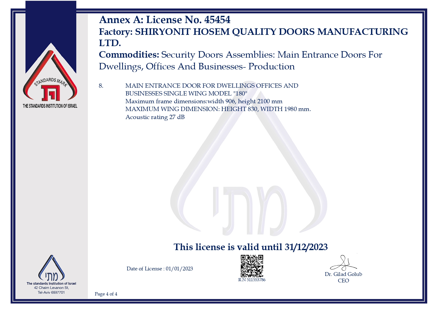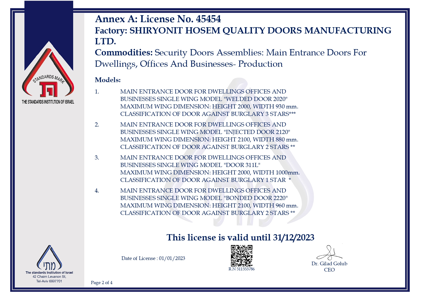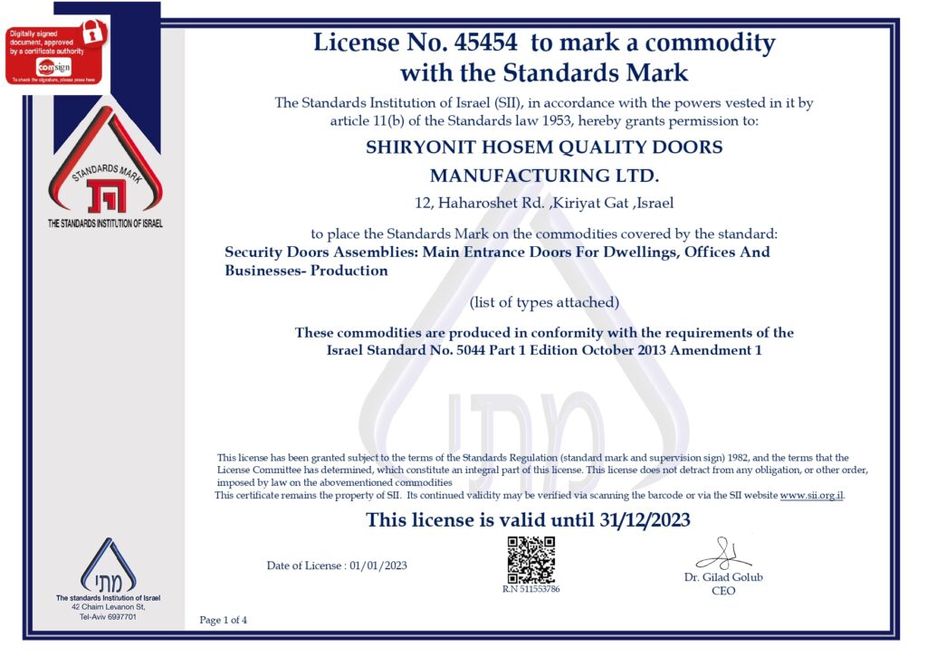 Our main entrance doors are certified for Israeli Standard 5044 Part 1. Our doors are tested in the Standards Institution of Israel, and certified for their resistance.